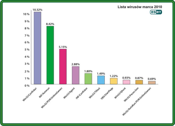 Conficker nie był jednak jedynym zagrożeniem z jakim w marcu stykali się internauci. Tuż za nim laboratoria ESET sklasyfikowały rodziny INF/Autorun oraz PSW/OnLineGames, które razem z robakiem Conficker, tworzą grupę najczęściej atakujących zagrożeń ostatnich miesięcy. W marcowym raporcie firma ESET wymienia również zagrożenia Win32/Tifaut oraza VBS/StartPage. Pierwsze z wymienionych infekuje komputery użytkowników wykorzystując pliki autostartu przenośnych nośników danych, a następnie wykrada cenne dane. Drugie z kolei zagrożenie podmienia stronę startową przeglądarki internetowej tak, aby wyświetlany był serwis z niechcianymi reklamami. Mimo, iż VBS/StartPage rozprzestrzenia się głównie w Chinach i innych krajach azjatyckich, zagrożenie to może znaleźć się na komputerach użytkowników również w Polsce. Zwykle jednak, jak twierdzą specjaliści, taka sytuacja może sugerować, że komputer został wcześniej zainfekowany innym złośliwym programem, który dopiero później przemycił do systemu właśnie VBS/StartPage.
