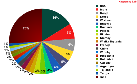 Spamerzy nauczyli się wykorzystywać nowe platformy internetowe, takie jak blogi i portale społecznościowe do własnych celów. Nasycenie rynku spamowego spowodowało zatrzymanie wzrostu liczby niechcianych wiadomości w ruchu pocztowym. Odsetek spamu utrzymywał się na stałym poziomie 85,2%. Podobny odsetek spamu odnotowaliśmy dla całego 2009 roku. W pierwszym kwartale nie wystąpiły żadne większe zmiany na liście państw uważanych za główne źródła spamu: na pierwszym miejscu uplasowały się Stany Zjednoczone (16%), tuż za nimi znalazły się Indie (7%) oraz Rosja (6%).