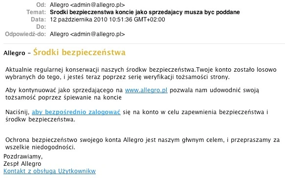 Phishingowa wiadomość e-mail skierowana przeciwko użytkownikom portalu aukcyjnego Allegro.pl
