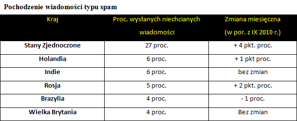 Październik był kolejnym miesiącem, w którym odnotowano spadek liczby spamu. Tematem niechcianych wiadomości staje się coraz częściej szeroko pojęta rozrywka (6 proc. wzrost). Maile te wysyłane są z popularnej domeny .com (53,7 proc.) lub rosyjskiej .ru (31,9 proc. w październiku, 23,2 proc. we wrześniu 2010 r.). Są one stosunkowo lekkie, w zdecydowanej większości ważą od 2 do 10 kilobajtów (ponad 83 proc.), co pozwala na ich szybką i skuteczną dystrybucję.