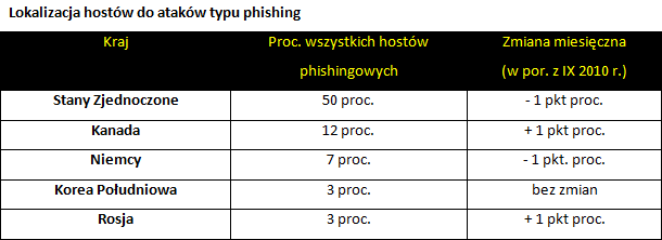 Poniższe tabele przedstawiają czołówkę krajów pod względem pochodzenia wiadomości spam oraz lokalizacji hostów, służących atakom typu phishing.