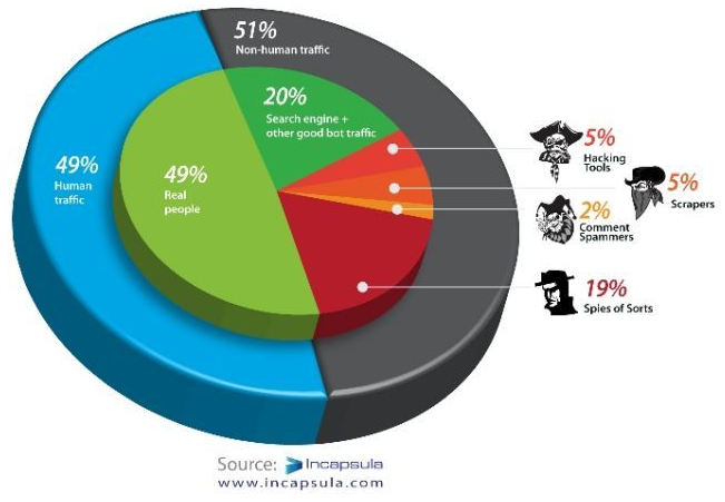 Okazuje się zatem, że spośród ponad połowy wejść na strony internetowe, ok. 20% stanowią boty wyszukiwarek internetowych. Niestety, pozostałe 31% to sami nieproszeni goście. Około 5% całego ruchu generują narzędzia hakerskie, które próbują zainstalować szkodliwe programy, przejąć numery kart kredytowych lub „rozwalić” witrynę. Kolejne 5% to tzw. „scrapery”, które kopiują zawartość ze stron internetowych.