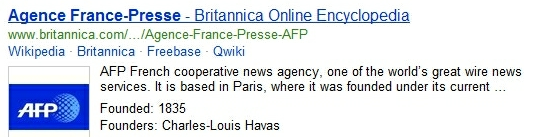 Linki do opisów z encyklopedii będą zawierały fragment artykułu i podstawowe fakty dotyczące zapytania. Przykład linku prowadzącego do artykuły Encyklopedii Britannica dla zapytania „Agence France-Presse” można zobaczyć poniżej. Zaktualizowana funkcja odpowiedzi będzie również nadal zawierać linki do innych źródeł online, w tym Wikipedii, Freebase i Qwiki.