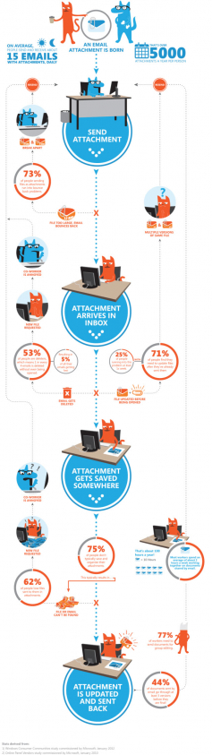 Zgodnie z wynikami badań zaprezentowanymi na wspomnianej infografice, 73 procent ludzi, którzy wysyłają załączniki, spotykają się z problemem spowodowanym zbyt dużym rozmiarem samego pliku, którego nie można przez to wysłać. Nawet jeśli e-mail został pomyślnie wysłany, wiele osób, które otrzymają e-mail z załącznikiem, usunęło go. Co więcej, 71 procent ludzi, którzy wysyłają załączniki e-mailem, zdaje sobie sprawę, że jeśli w grę wchodzi aktualizacja pliku, trzeba załadować, a następnie wysłać go ponownie. 62 procent osób uczestniczących w badaniu przyznała się do utraty danego pliku, który został wysłany jako załącznik.
