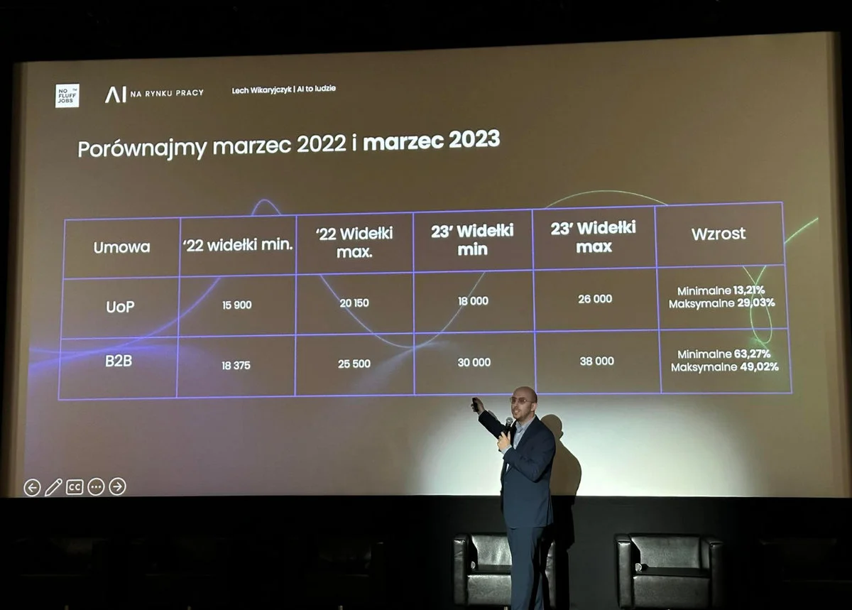 No Fluff Jobs sprawdziło, jak w ciągu ostatnich lat zmieniały się zarobki specjalistów AI. W 2020 specjaliści w tej kategorii mogli liczyć na zarobki sięgające 12 – 17 tys. złotych brutto na UoP oraz 15,1 – 21 tys. złotych netto na B2B. W 2021 było to już 12,5 – 18 tys. złotych na UoP oraz 17 – 23,7 tys. złotych na B2B, a w 2022 mowa o 13 – 20 tys. złotych na UoP oraz 18,5 – 26 tys. złotych na B2B. W 2023 zarobki kształtują się obecnie na poziomie 16 – 26 tys. złotych brutto na UoP oraz 20 – 29,4 tys. złotych netto (+VAT) na B2B.