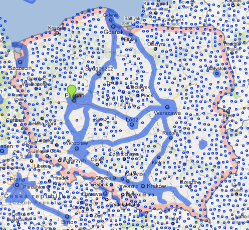 Obszar objęty usługą zaznaczony jest na niebiesko: