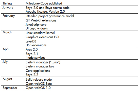 Zgodnie z podanym przez HP harmonogramem wydań, od stycznia co miesiąc przez najbliższe 7 miesięcy (z wyłączeniem czerwca i lipca) pojawiać się będą kolejne kamyczki na drodze do Open WebOS 1.0. Wolnoźródłowy WebOS ma zostać przeniesiony do standardowego jądra Linuksa, dzięki czemu system będzie mógł zostać wykorzystany do pracy na szerszej gamie sprzętu.