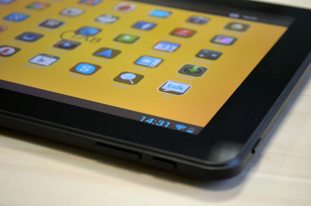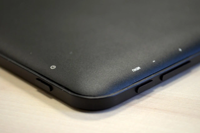 Wszystkie istotne przyciski rozmieszczono na bokach tabletu. Tam również znajdują się rozmaite porty i złącza. Na górnej, krótszej krawędzi obudowy znajdziemy przycisk włączania oraz gniazdo słuchawek mini-jack 3,5mm. Po przeciwnej stronie znajdują się głośniki, slot karty pamięci MicroSD, port Micro-USB, wyjście HDMI, gniazdo ładowania oraz USB-Host do obsługi urządzeń zewnętrznych. Na jednej z bocznych krawędzi znajdziemy dodatkowo przycisk Menu oraz przyciski regulacji głośności. Rozmieszczenie przycisków i portów jest trochę przekombinowane i jest ich za dużo. Na dobrą sprawę wystarczyłby jeden przycisk włączania. Obudowa znajdująca się z tyłu urządzenia wykonana została z czarnego aluminium. Jest to materiał podatny na zarysowania jednak doskonale pasuje do tabletu i sprawia wrażenie solidnej konstrukcji. Gorzej wypadają przyciski na krawędziach które sprawiają wrażenie nieco tandetnych i plastikowych. Całą obudowę oceniamy pozytywnie, nie widać niedopasowania czy luk na łączeniach.